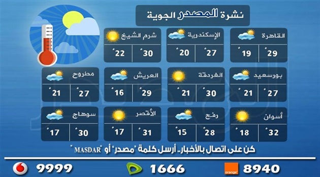 وفيما يلي بيان بدرجات الحرارة المتوقعة اليوم في المدن والمحافظات: