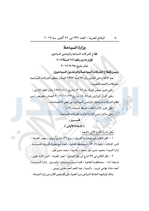 ونص القرار على غلق المقر الكائن في عمارة "محمود عبد التواب" - شقة رقم "1" الدور الأول علوي، شارع الشواربي، بمحافظة أسوان، تحت اسم شركة سوان للسياحة، كما قررت الوازرة غلق المقر الكائن في عمارات الشريف، برج "2" شارع أسوان - مصر الجديدة - الدور الثالث - شقة 302 - بمحافظة القاهرة، تحت اسم "جلوبال أورينت للسياحة، وكذلك إغلاق المقر الكائن في 37 شارع أبو بكر الصديق - مصر الجديدة - الدول الأول علوي - شقة "4" بمحافظة القاهرة.