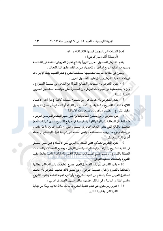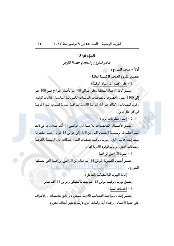 نشرت الجريدة الرسمية في العدد رقم 45 الصادر بتاريخ 9 نوفمبر 2017 قرار رئيس الجمهورية رقم 383 لسنة 2016، بشأن الموافقة على اتفاقية قرض للمساهمة في مشروع تطوير منظومة الزراعة بشبه جزيرة سيناء بين الحكومة المصرية والصندوق العربي للإنماء الاقتصادي والاجتماعي الموقعة في المنامة بتاريخ 5 أبريل 2016.