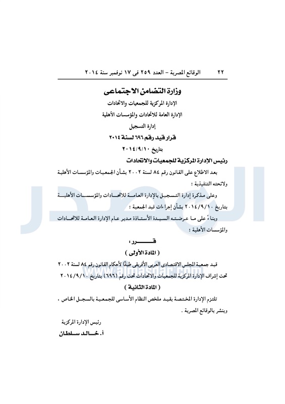 نشرت "الوقائع المصرية "قرار الإدارة المركزية للجمعيات والإتحادات والمؤسسات الأهلية التابعة لوزارة التضامن الإجتماعى عن قيد جمعية المجلس الإقتصادى العربى الأفريقى والى نص القرار : قرار وزارة التضامن الاجتماعي بشأن قيد الجمعيات والموسسات الاهلية، وذلك بناءاً علي ما عرضتة مدير عام الادارة العامه للإتحاد والمؤسسات الاهلية