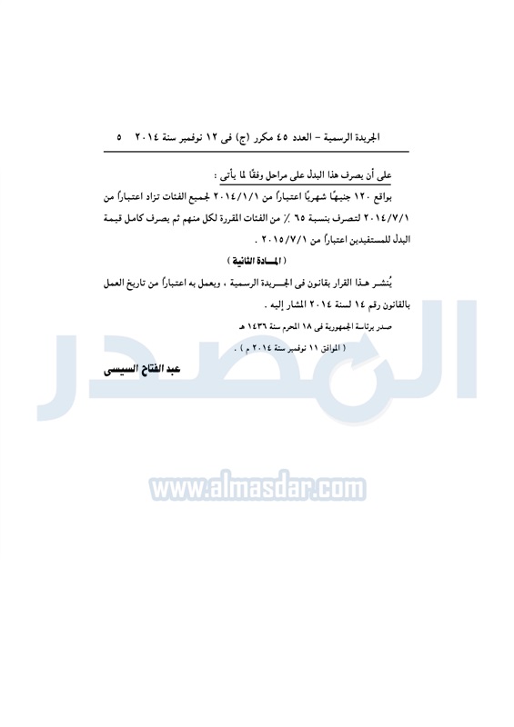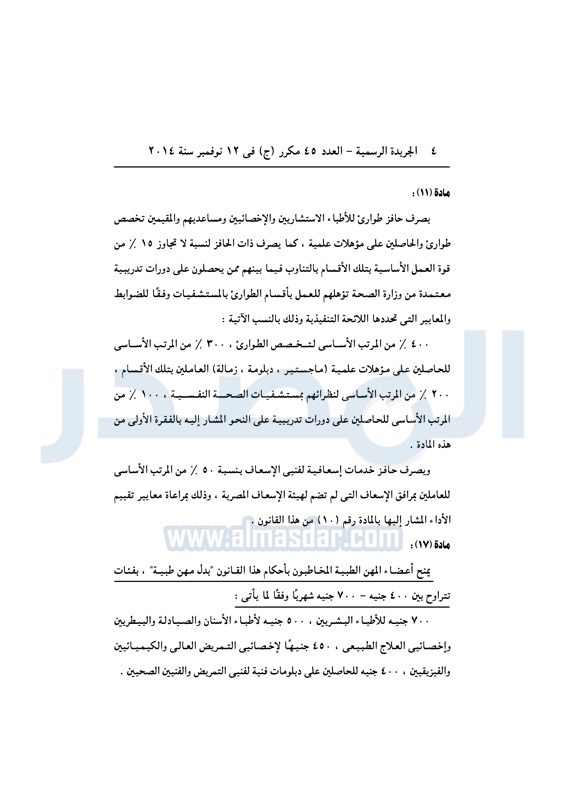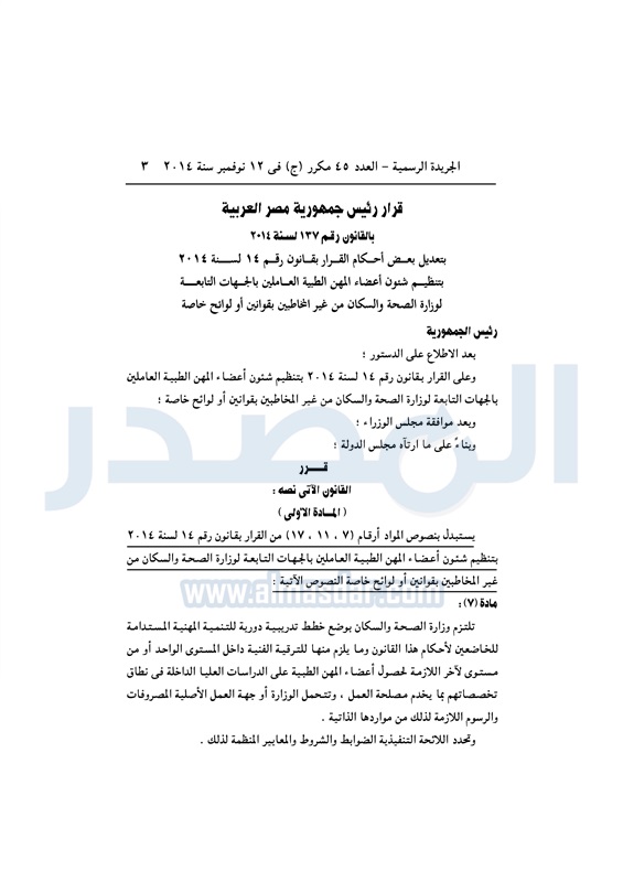 تنشر الجريدة الرسمية القرار رئاسة الجمهورية بتعديل بعض أحكام القرار رقم 14 لسنة 2014 بتنظيم شئون أعضاء المهن الطبية العاملين بالجهات العمومية التابعة لوزارة الصحة والسكان من غير المحاطين بقوانين أو لوائح خاصة
