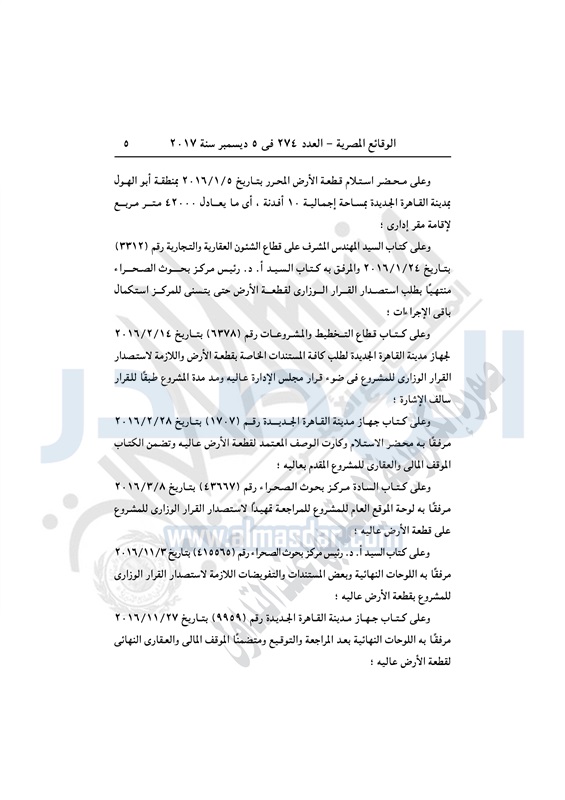 نشرت الوقائع المصرية في العدد رقم 274 الصادر في تاريخ 5 ديسمبر 2017 قرار وزارة الإسكان والمرافق والمجتمعات العمرانية رقم 345 لسنة 2017 الصادر بتاريخ 20 مايو 2017 بشأن إقامة مقر إداري لمركز بحوث الصحراء.