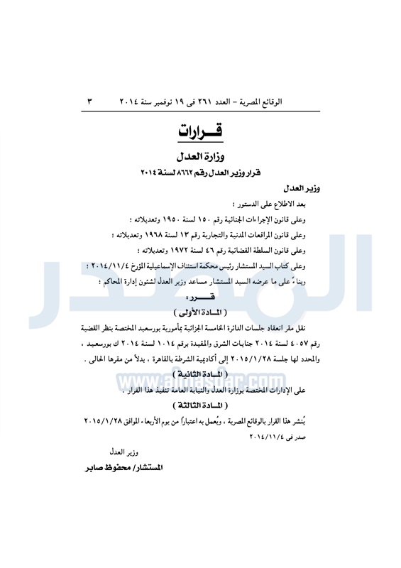 نشرت الجريدة الرسمية قرارالمستشار محفوظ صابر "وزير العدل" الخاص بنقل مقر انعقاد جلسات الدائرة الخامسة فى مأمورية بورسعيد المختصة بنظر القضية رقم (4057) لسنة 2014الى اكاديمية الشرطة بالقاهرة .