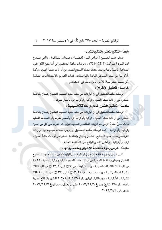 نشرت الوقائع المصرية فى العدد 275 تابع "أ" الصادر فى 6 ديسمبر سنة 2017 القرار رقم 1535 لسنة 2017 والاعلان رقم "10" لسنة 2017 الصادر عن وزارة التجارة والصناعة بشان فرض رسوم نهائية لمكافحة الاغراق على الواردات المغرقة من صنف حديد التسليح "قضبان وعيدان ولفائف" المصدرة من أو ذات منشأ الصين وتركيا واوكرانيا.