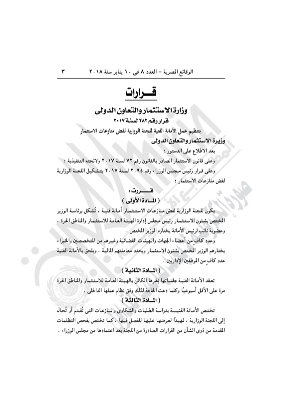 نشرت الوقائع المصرية في العدد رقم 8 الصادر في 10 يناير 2018، قرار وزارة الاستثمار والتعاون الدولي رقم 282 لعام 2017، والخاص بتشكيل وتنظيم عمل الأمانة الفنية للجنة الوزارية لفض منازعات الاستثمار.