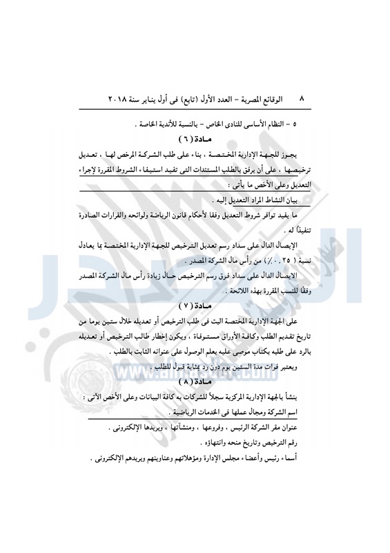 نشرت الوقائع المصرية في العدد الأول "تابع" الصادر بتاريخ 1 يناير 2018 قرار وزارة الشباب والرياضة رقم 1124 لسنة 2017 الصادر بتاريخ 7 ديسمبر 2017 بشأن اعتماد لائحة قواعد منح تراخيص شركات الخدمات الرياضية.