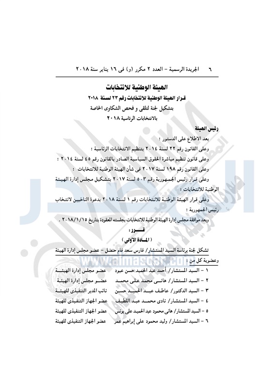 نشرت الجريدة الرسمية في العدد رقم 2 مكرر "و" الصادر بتاريخ 16 يناير 2018 قرارات اللجنة الوطنية للانتخابات أرقام 22 و23 و24 لسنة 2018 بشأن ضوابط التمويل والإنفاق بالحملات الانتخابية، وبتشكيل لجنة لتلقي وفحص الشكاوى وضوابط تنظيم ساعة الراحة في اللجان الفرعية خلال الانتخابات الرئاسية 2018.