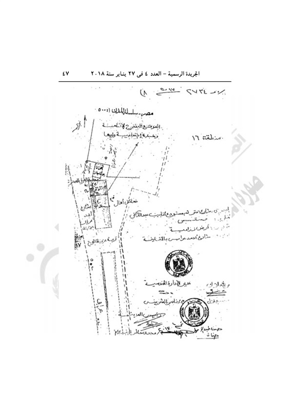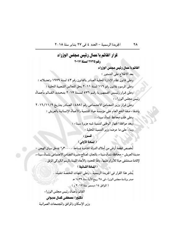 نشرت الجريدة الرسمية في العدد رقم 4 والصادر في 27 يناير 2018 قرارات القائم بأعمال رئيس مجلس الوزراء أرقام 2725 و2726 و2727 و2728 و2729 و2730 و2731 لعام 2017، والخاصة بتخصيص قطع من الأراضي المملوكة للدولة ملكية خاصة وذلك لإنشاء عدد من المشروعات التنموية بعدد من المحافظات.