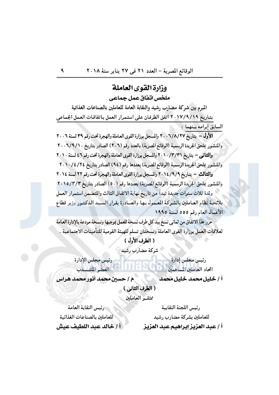 الوقائع تنشر اتفاق شركة مضارب رشيد ونقابة العاملين بالصناعات الغذائية
