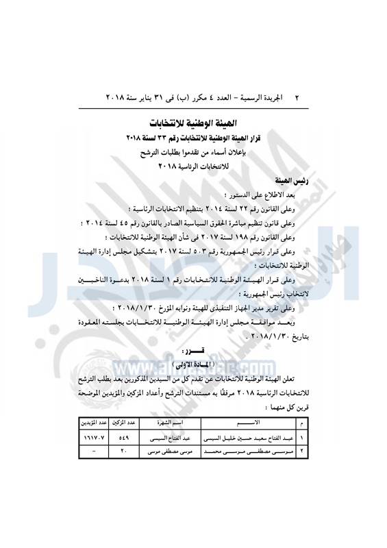 نشرت الجريدة الرسمية في العدد رقم 4 مكرر "ب" الصادر بتاريخ 31 يناير 2018 قرار الهيئة الوطنية للانتخابات رقم 33 لسنة 2018 بإعلان أسماء من تقدموا بطلبات الترشح للانتخابات الرئاسية 2018.