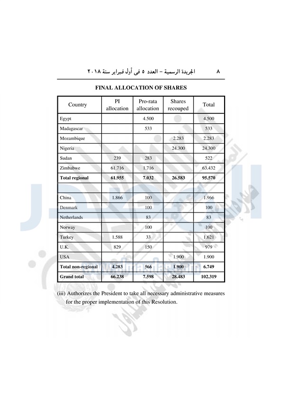 نشرت الجريدة الرسمية في العدد رقم 5 الصادر بتاريخ 1 فبراير 2018 قرار رئيس الجمهورية رقم 381 لسنة 2017 بالموافقة على قرار مجلس إدارة بنك التنمية الإفريقي رقم 2017/08 الصادر بتاريخ 21 مارس 2017 بشأن تخصيص أسهم في إطار قواعد تحويل ملكية الأسهم المتاحة للاكتتاب في الفترة المنتهية في 30 سبتمبر 2016، وأداة اكتتاب الحكومة المصرية في الأسهم المخصصة لمصر في إطار الزيادتين العامتين الخامسة والسادسة لرأس مال بنك التنمية الإفريقي.