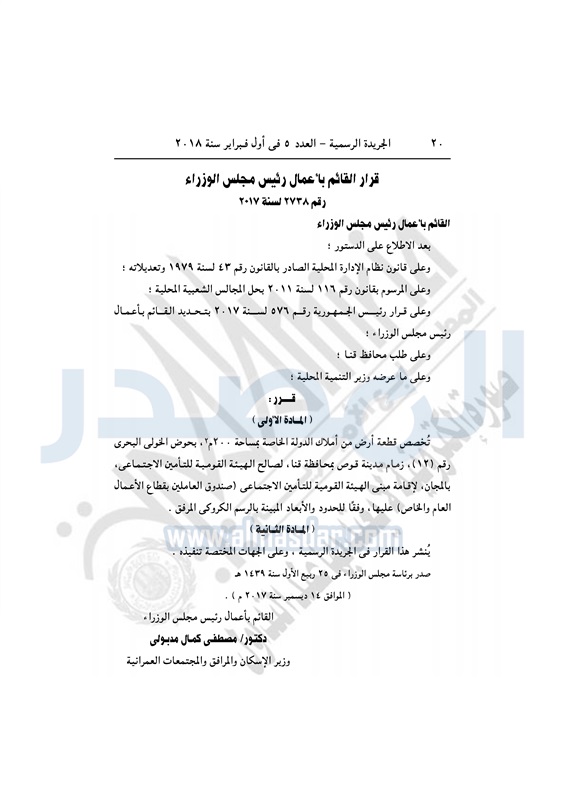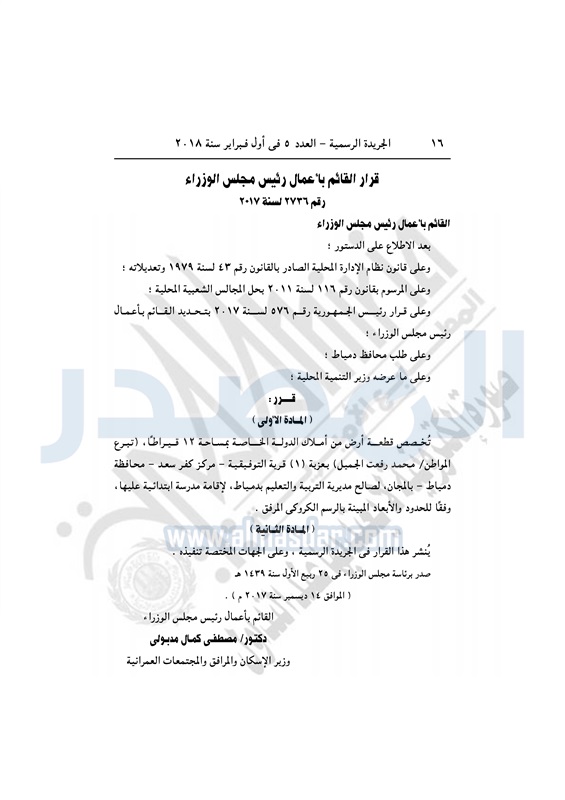 نشرت الجريدة الرسمية في العدد رقم 5 الصادر بتاريخ 1 فبراير 2018 قرارات القائم بأعمال رئيس مجلس الوزراء أرقام 2735 و2736 و2737 و2738 و2739 و2740 و2822 و2823 و2824 و2825 و2826 و2827 بشأن تخصيص قطع أراضي من أملاك الدولة بمحافظات دمياط وقنا وكفر الشيخ وأسوان وسوهاج لإقامة مدارس ومحطات كهرباء.
