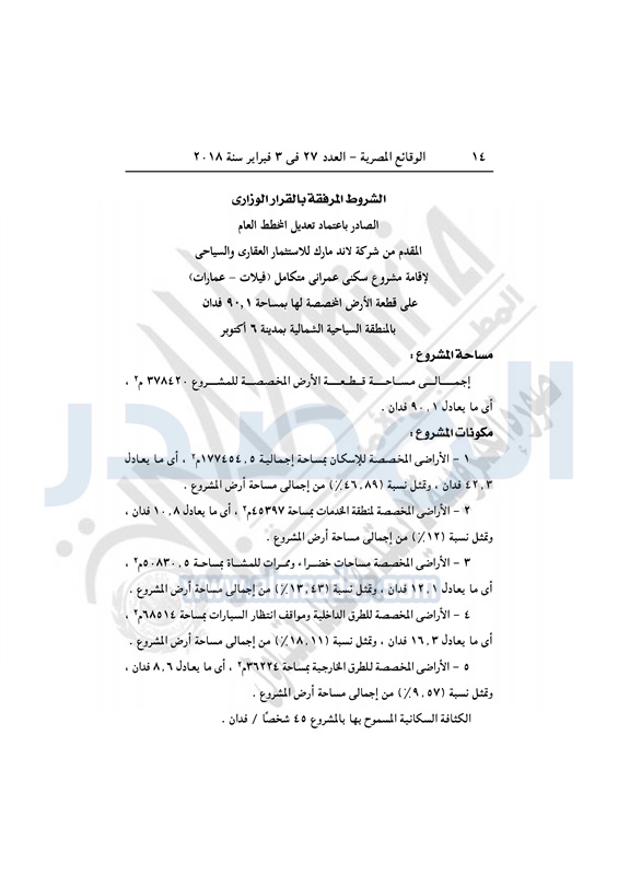 نشرت الوقائع المصرية في العدد رقم 27 الصادر بتاريخ 3 فبراير 2018 قرار وزارة الإسكان والمرافق والمجتمعات العمرانية رقم 936 لسنة 2017 الصادر بتاريخ 26 أكتوبر 2017 بشأن اعتماد تعديل تخطيط وتقسيم قطعة أرض رقم 3 بالمنطقة السياحية الشمالية بمدينة 6 أكتوبر لشركة لاند مارك للاستثمار العقاري لإقامة مشروع سكني متكامل.