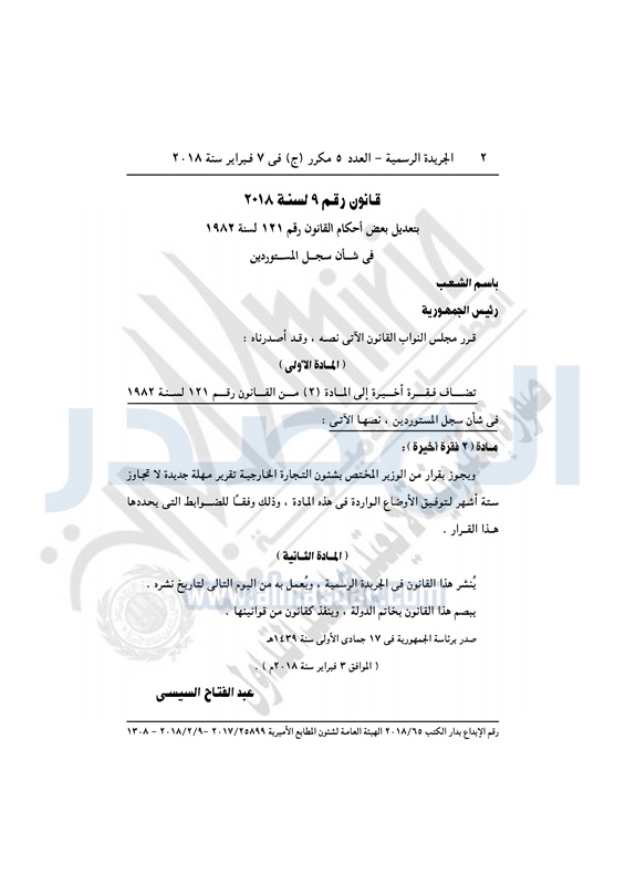 أسواق الجريدة الرسمية تنشر نص تعديلات قانون سجل المستوردين الأحد 11 فبراير 2018 - 10:20 ص 2/11/2018 10:20:00 AM البرلمان يوافق على تعديل قانون سجل المستوردين المصدر - خاص طباعة شارك نشرت الجريدة الرسمية في العدد رقم 5 مكرر "ج" والصادر في 7 فبراير 2018، قانون رقم 9 لعام 2018 والخاص بتعديل بعض أحكام قانون رقم 121 لعام 1982 في شأن سجل المستوردين.لقراءة نص القرار: طباعة شارك مجلس النواب قرار جمهورى سجل المستوردين تعديل نص المادة الجريدة الرسمية تابع المصدر علي جوجل نيوز تطبيق نبض