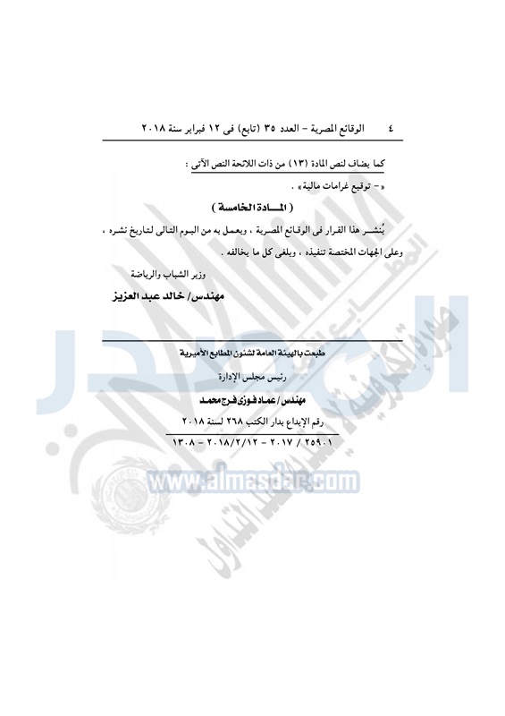 نشرت الوقائع المصرية في العدد رقم 35 تابع الصادر بتاريخ 12 فبراير 2018 قرار وزارة الشباب والرياضة رقم 125 لسنة 2018 بشأن تعديل لائحة قواعد منح تراخيص شركات الخدمات الرياضية الصادرة بالقرار الوزاري رقم 1124 لسنة 2017.