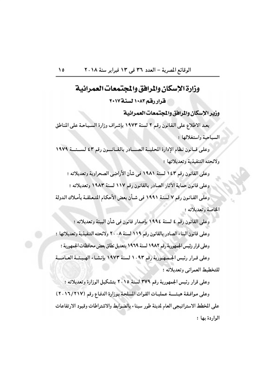نشرت الوقائع المصرية في العدد رقم 36 والصادر في 13 فبراير 2018، قرارات وزارة الإسكان أرقام 960 و1083 لعام 2017 والخاص باعتماد المخطط الاستراتيجي لمدينة بلقاس بمحافظة الدقهلية ومدينة الطور بمحافظة جنوب سيناء.