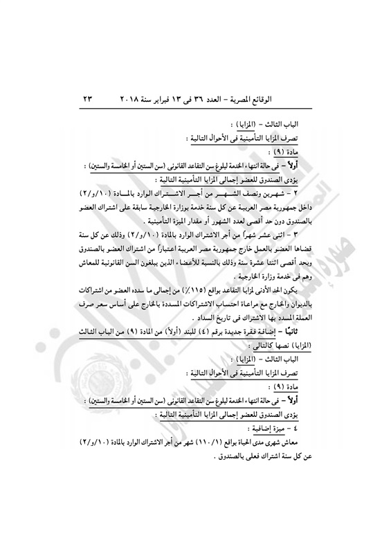 نشرت الوقائع المصرية في العدد رقم 36 والصادر في 13 نوفمبر 2018 قرار الهيئة العامة للرقابة المالية رقم 2300 لعام 2017، والخاص باعتماد تعديل لائحة النظام الأساسي لصندوق التأمين الخاص للعاملين بوزارة الخارجية من غير أعضاء السلك الدبلوماسي والقنصلي.