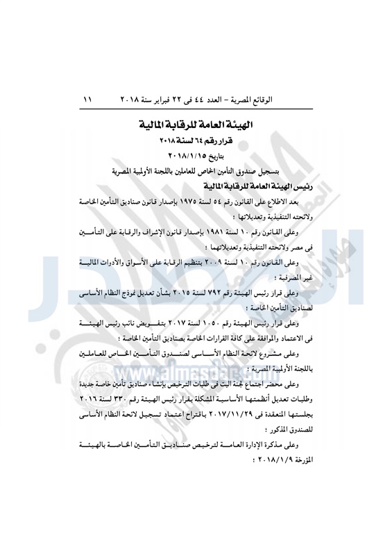 نشرت الوقائع المصرية في العدد رقم 44 والصادر في 22 فبراير 2018، قرار الهيئة العامة للرقابة المالية رقم 64 لعام 2018، والخاص بتسجيل صندوق التأمين الخاص للعاملين باللجنة الأولمبية المصرية.