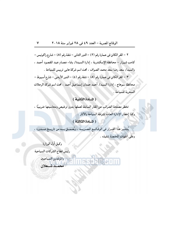 نشرت الوقائع المصرية في العدد رقم 49 الصادر بتاريخ 28 فبراير 2018 قرار قطاع الشركات السياحية والمرشدين السياحيين بوزارة السياحة رقم 136 لسنة 2018 الصادر بتاريخ 1 فبراير 2018 بإغلاق 3 شركات سياحية لعملها بدون ترخيص.