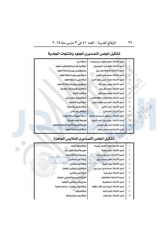 نشرت الوقائع المصرية في العدد رقم 51 الصادر بتاريخ 3 مارس 2018 قرار وزارة التجارة والصناعة رقم 1529 لسنة 2017 الصادر بتاريخ 5 ديسمبر 2017 بشأن تشكيل بعض المجالس التصديرية.