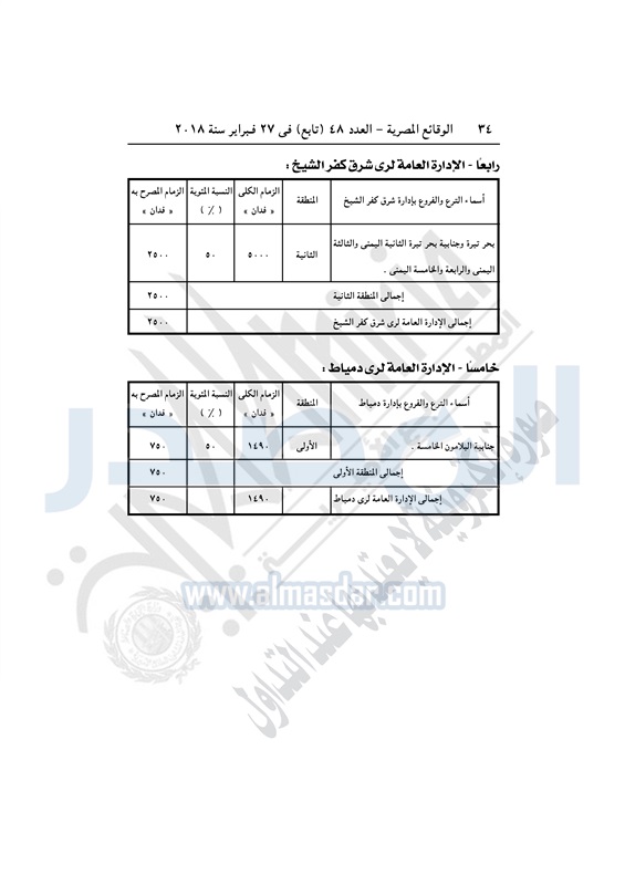 نشرت الوقائع المصرية في العدد رقم 48 "تابع" الصادر بتاريخ 27 فبراير لسنة 2018 قرار وزارة الموارد المائية والري رقم 28 لسنة 2018 الصادر بتاريخ 23 يناير 2018 بترخيص زراعة الأرز في محافظات بعينها بمساحات محددة قرين كل محافظة بحيث تبلغ جملة المساحة المصرح بها 724,2 ألف فدان.