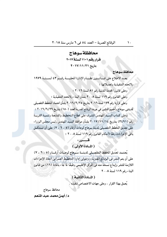 عقارات الوقائع المصرية: اعتماد المخطط التفصيلي لمدينة سوهاج الثلاثاء 06 مارس 2018 - 10:52 ص 3/6/2018 10:52:00 AM الدكتور أيمن عبد المنعم - محافظ سوهاج المصدر - خاص طباعة شارك نشرت الوقائع المصرية في العدد رقم 54 الصادر بتاريخ 6 مارس 2018 قرار محافظة سوهاج رقم 1101 لسنة 2017 باعتماد المخطط التفصيلي لمدينة سوهاج.وفيما يلي نص القرار: طباعة شارك محافظة سوهاج الوقائع المصرية المخطط التفصيلي التنمية العمرانية التنمية العقارية أيمن عبد المنعم تابع المصدر علي جوجل نيوز تطبيق نبض