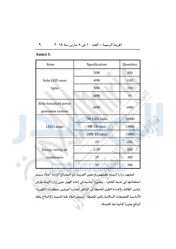 نشرت الجريدة الرسمية في العدد رقم 10 الصادر بتاريخ 8 مارس 2018 قرار رئيس الجمهورية رقم 445 لسنة 2017 بشأن الموافقة على مذكرة التفاهم الموقعة بتاريخ 21 يناير 2016 بين مصر ممثلة بوزارة البيئة، والصين ممثلة باللجنة الوطنية للتنمية والإصلاح بشأن توريد بضائع كمنحة لوزارة البيئة لمواجهة التغيرات المناخية والاتفاق التكميلي لها والمواقع في 16 يناير 2017.
