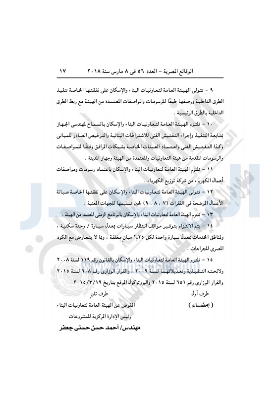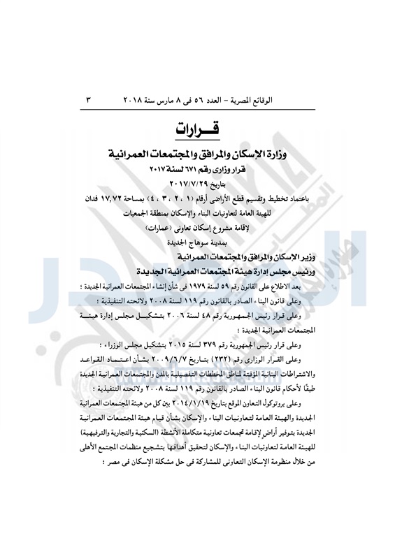نشرت الوقائع المصرية في العدد رقم 56 الصادر بتاريخ 8 مارس 2018 قرار وزارة الإسكان والمرافق والمجتمعات العمرانية رقم 671 لسنة 2017 الصاد ربتاريخ 29 يوليو 2017 باعتماد تخطيط وتقسيم قطع الأراضي أرقام "1، 2، 3، 4" للهيئة العامة لتعاونيات البناء والإسكان بمنطقة الجمعيات لإقامة مشروع إسكان تعاوني "عمارات" بمدينة سوهاج الجديدة.