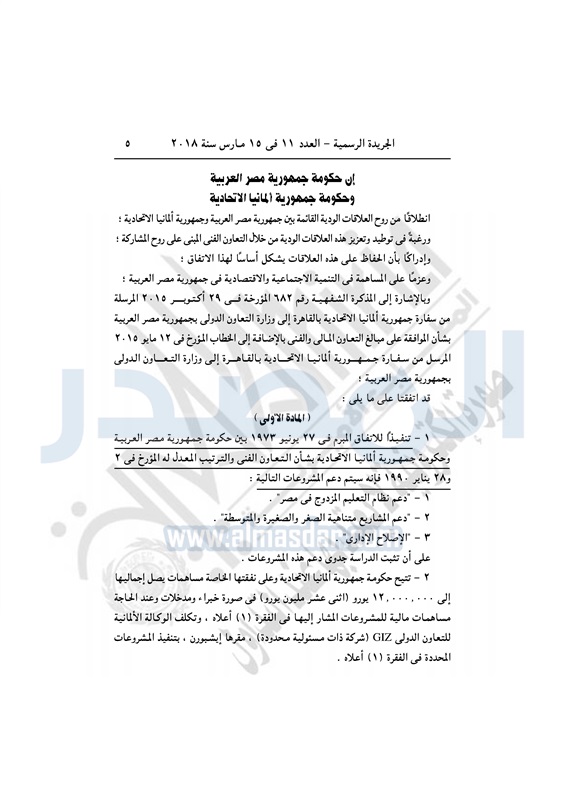 نشرت الجريدة الرسمية في العدد رقم 11 الصادر بتاريخ 15 مارس 2018 قرار رئيس الجمهورية رقم 507 لسنة 2017 بالموافقة على الاتفاق بين حكومتي مصر وألمانيا بشأن التعاون الفني لعام 2015، والموقع في القاهرة بتاريخ 12 يونيو 2017.