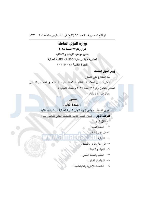 نشرت الوقائع المصرية في العدد رقم 61 تابع الصادر بتاريخ 14 مارس 2018 قرار وزارة القوى العاملة رقم 37 لسنة 2018 بشأن مواعيد الترشح والانتخاب لعضوية مجالس إدارة المنظمات النقابية العمالية للدورة النقابية 2022/2018.