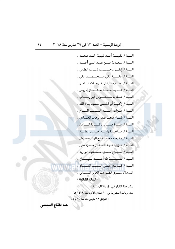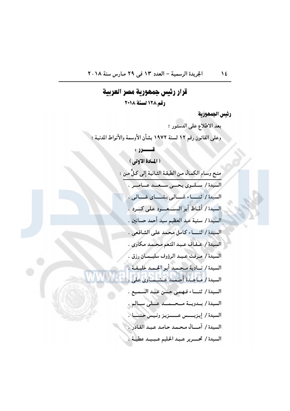 أخبار مصر الرئيس يمنح وسام الكمال من الطبقة الثانية لـ 32 سيدة الخميس 29 مارس 2018 - 09:47 ص 3/29/2018 9:47:00 AM الرئيس المصري عبد الفتاح السيسي المصدر - خاص طباعة شارك نشرت الجريدة الرسمية في العدد رقم 13 الصادر بتاريخ 29 مارس 2018 قرار رئيس الجمهورية رقم 128 لسنة 2018 بمنح وسام الكمال من الطبقة الثانية لـ 32 سيدة.وفيما يلي نص القرار: طباعة شارك وسام الكمال تكريم المرأة المصرية المرأة الرئيس عبد الفتاح السيسي الجريدة الرسمية تابع المصدر علي جوجل نيوز تطبيق نبض