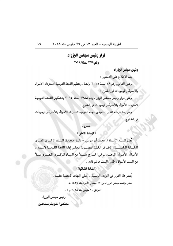 نشرت الجريدة الرسمية في العدد رقم 13 الصادر بتاريخ 29 مارس 2018 قرار رئيس مجلس الوزراء رقم 379 لسنة 2018 بضم محمد أبو موسى وكيل محافظ البنك المركزي المصري للرقابة المكتبية والمخاطر الكلية لعضوية مجلس إدارة اللجنة القومية لاسترداد الأموال والأصول والموجودات في الخارج.