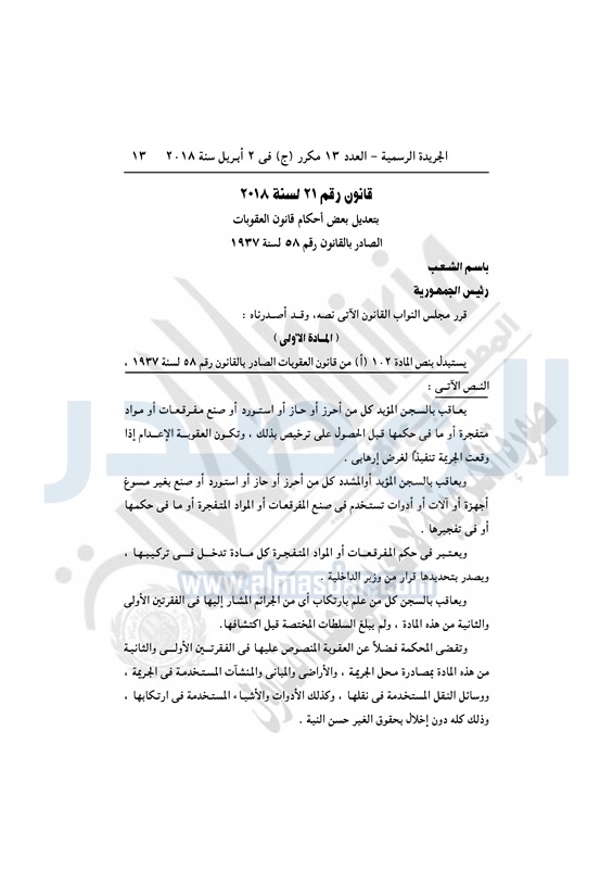 نشرت الجريدة الرسمية في العدد رقم 13 مكرر "ج" الصادر بتاريخ 2 إبريل 2018 قانون رقم 21 لسنة 2018 بتعديل بعض أحكام قانون العقوبات الصادر بالقانون رقم 58 لسنة 1937.