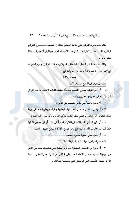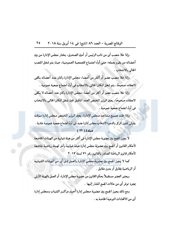 نشرت الوقائع المصرية في العدد رقم 86 تابع الصادر بتاريخ 14 إبريل سنة 2018 قرار وزارة الشباب والرياضة رقم 36 لسنة 2018 الصادر بتاريخ 12 إبريل 2018 باعتماد النظام الأساسي لمراكز الشباب غير الأعضاء بالجمعيات العمومية للاتحادات الرياضية.