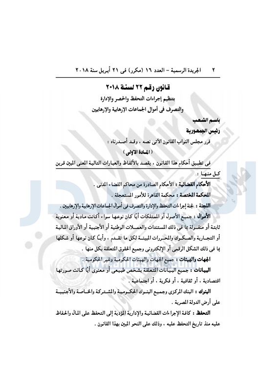 نشرت الجريدة الرسمية في العدد رقم 16 مكرر الصادر بتاريخ 21 إبريل 2018 قانون رقم 22 لسنة 2018 بتنظيم إجراءات التحفظ والحصر والإدارة والتصرف في أموال الجماعات الإرهابية والإرهابيين.