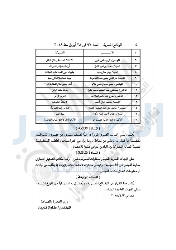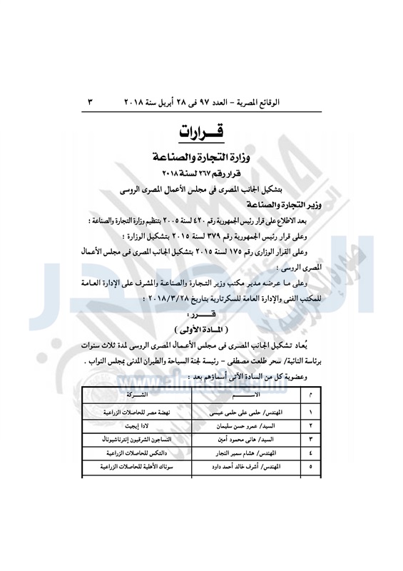 نشرت الوقائع المصرية في العدد رقم 97 الصادر بتاريخ 28 إبريل 2018 قرار وزارة التجارة والصناعة رقم 267 لسنة 2018 بتشكيل الجانب المصري في مجلس الأعمال المصري الروسي.