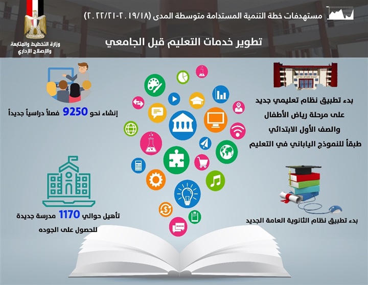 وأشارت الوزارة، في إنفوجراف نشرته على صفحتها الرسمية على "فيسبوك" اليوم الأربعاء، إلى أن خطة التنمية المستدامة متوسطة المدي "18/2019_21/2022" تستهدف تطبيق نظام تعليمي جديد.
