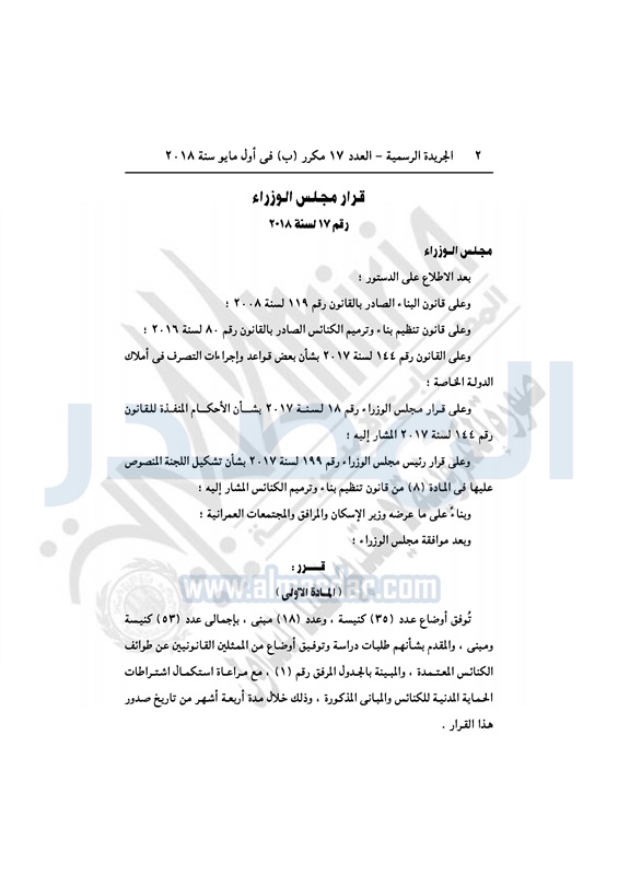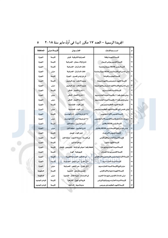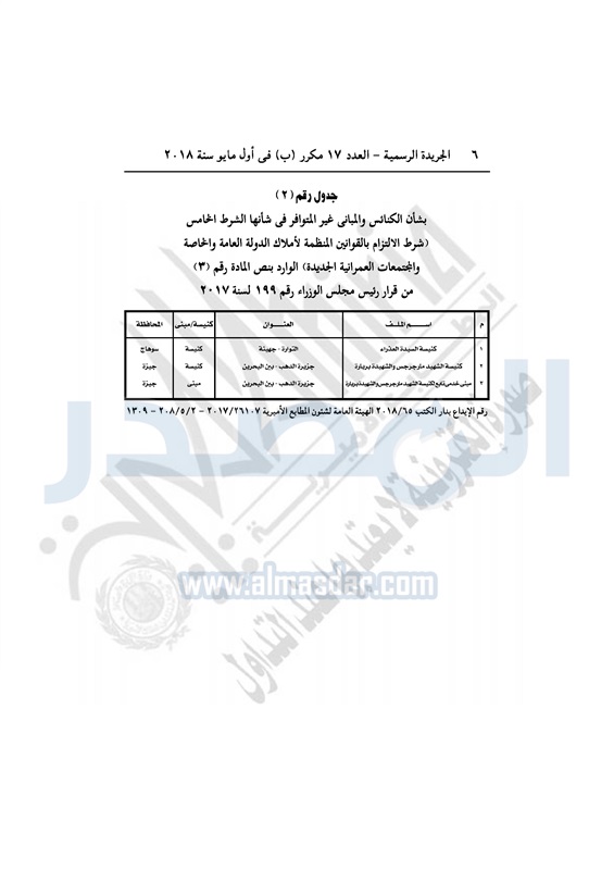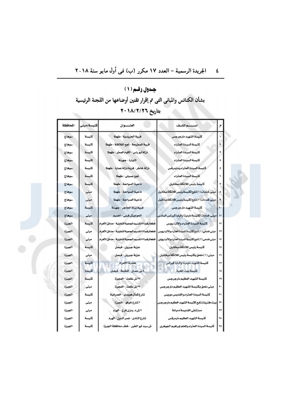 عقارات "الوزراء" يوافق على تقنين أوضاع 53 كنيسة ومبنى تابع الأربعاء 02 مايو 2018 - 04:44 م 5/2/2018 4:44:00 PM المهندس شريف إسماعيل - رئيس مجلس الوزراء المصدر - خاص طباعة شارك نشرت الجريدة الرسمية في العدد رقم 17 مكرر "ب" الصادر بتاريخ 1 مايو 2018 قرار مجلس الوزراء رقم 17 لسنة 2018 بتوفيق أوضاع 53 كنيسة ومبنى تابع "35 كنيسة، 18 مبنى تابع".وفيما يلي نص القرار: طباعة شارك مسيحيين مجلس الوزراء قانون تنظيم بناء وترميم الكنائس اللجنة العليا لتقنين أوضاع الكنائس الكنائس تابع المصدر علي جوجل نيوز تطبيق نبض