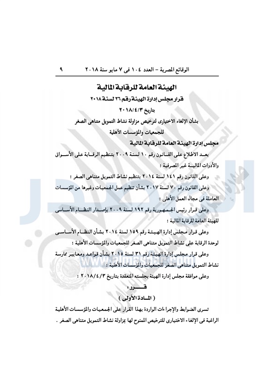 نشرت الوقائع المصرية في العدد رقم 104 الصادر بتاريخ 7 مايو 2018 قرار مجلس إدارة الهيئة العامة للرقابة المالية رقم 36 لسنة 2018 الصادر بتاريخ 3 إبريل 2018 بشأن الإلغاء الاختياري لترخيص مزاولة نشاط التمويل متناهي الصغر للجمعيات والمؤسسات الأهلية.