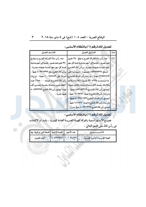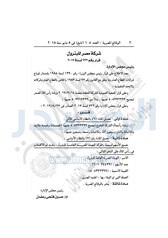 بترول وطاقة شركة مصر للبترول تقرر زيادة رأس مالها المدفوع الثلاثاء 08 مايو 2018 - 05:15 م 5/8/2018 5:15:00 PM محطة وقود تابعة لشركة مصر للبترول - صورة أرشيفية المصدر - خاص طباعة شارك نشرت الوقائع المصرية في العدد رقم 105 تابع الصادر بتاريخ 8 مايو 2018 قرار شركة مصر للبترول رقم 722 لسنة 2017 بزيادة رأس مالها المدفوع إلى 505,372,399 جنيه.وفيما يلي نص القرار: طباعة شارك وزارة البترول شركة مصر للبترول شركات البترول زيادة رؤوس رأس المال المدفوع الوقائع المصرية تابع المصدر علي جوجل نيوز تطبيق نبض