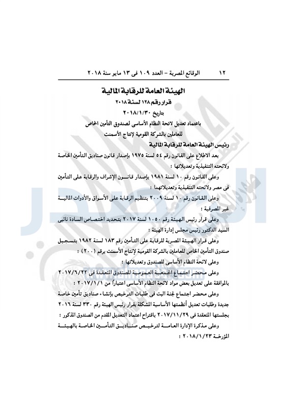 نشرت الوقائع المصرية في العدد رقم 109 الصادر بتاريخ 13 مايو 2018 قرار الهيئة العامة للرقابة المالية رقم 128 لسنة 2018 الصادر بتاريخ 30 يناير 2018 باعتماد تعديل لائحة النظام الأساسي لصندوق التأمين الخاص للعاملين بالشركة القومية لإنتاج الإسمنت.