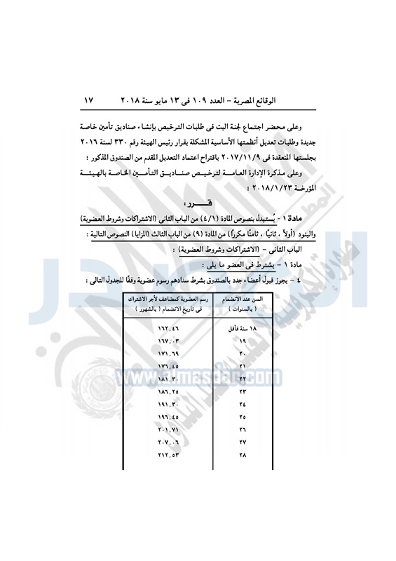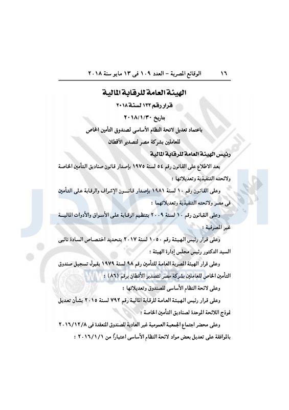 نشرت الوقائع المصرية في العدد رقم 109 الصادر بتاريخ 13 مايو 2018 قرار الهيئة العامة للرقابة المالية رقم 133 لسنة 2018 الصادر بتاريخ 30 يناير 2018 باعتماد تعديل لائحة النظام الأساسي لصندوق التأمين الخاص للعاملين بشركة مصر لتصدير الأقطان.