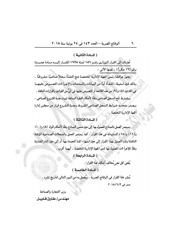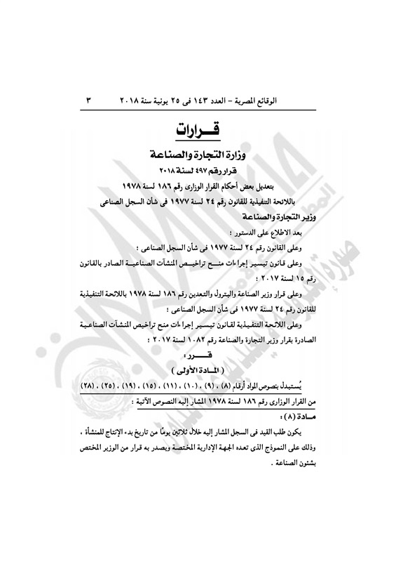 أسواق قرار وزارى بتعديل فى "تنفيذية" قانون تراخيص المنشأت الصناعية الإثنين 25 يونيو 2018 - 09:57 ص 6/25/2018 9:57:50 AM عمرو نصار - وزير الصناعة والتجارة المصدر - خاص طباعة شارك نشرت الوقائع المصرية في العدد رقم 143 بتاريخ 25 يونيه 2018، قرارًا لوزارة التجارة والصناعة رقم 497 لسنة 2018، بتعديل بعض أحكام القرار الوزارى رقم 186 لسنة 1978 باللائحة التنفيذية للقانون رقم 24 لسنة 1977 في شأن السجل الصناعي.وفيما يلي نص القرار: طباعة شارك وزاره التجاره والصناعه قرار تعديل الوقائع المصرية القرار الوزاري احكام تابع المصدر علي جوجل نيوز تطبيق نبض