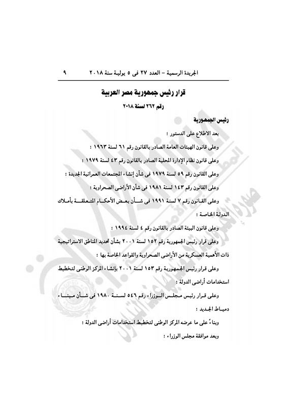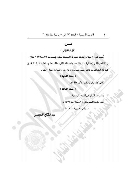 عقارات قرار جمهورى بتعديل كردون ميناء ومدينة دمياط الجديدة الخميس 05 يوليو 2018 - 09:51 ص 7/5/2018 9:51:00 AM الرئيس عبد الفتاح السيسي - صورة أرشيفية المصدر - خاص طباعة شارك نشرت الجريدة الرسمية في العدد رقم 27 بتاريخ 5 يوليو 2018، قرار رئيس جمهورية مصر العربية رقم 262 لسنة 2018.وفيما يلي نص القرار: طباعة شارك قرار رئيس الجمهورية رئيس الجمهورية الرئيس السيسي الجريدة الرسمية تابع المصدر علي جوجل نيوز تطبيق نبض