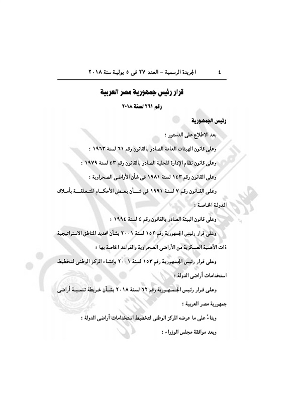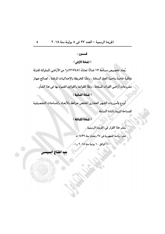 عقارات تخصيص 17 فداناً فى"العين السخنة" لصالح "مشروعات أراضى القوات المسلحة" الخميس 05 يوليو 2018 - 10:12 ص 7/5/2018 10:12:00 AM عبد الفتاح السيسى - رئيس جمهورية مصر العربية المصدر - خاص طباعة شارك نشرت الجريدة الرسمية في العدد رقم 27 بتاريخ 5 يوليو 2018، قرار رئيس جمهورية مصر العربية رقم 261 لسنة 2018.وفيما يلي نص القرار: طباعة شارك قرار رئيس الجمهورية رئيس الجمهورية تخصيص أراضي الاراضي الصحراوية تابع المصدر علي جوجل نيوز تطبيق نبض