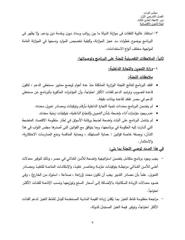 ومن المقرر أن تسلم اللجنة الاقتصادية توصياتها إلى اللجنة الخاصة المشكلة للرد على البيان، برئاسة وكيل المجلس السيد الشريف، والمنوط بها تقديم تقريرها النهائى إلى رئيس البرلمان غدا الخميس.