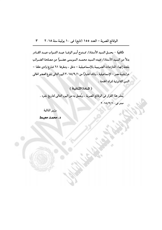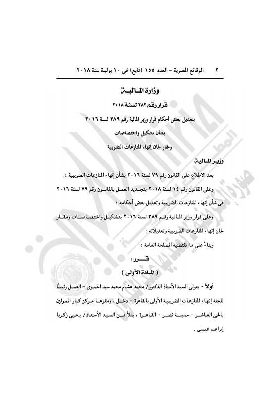 أخبار مصر "المالية": إعادة تشكيل لجان إنهاء المنازعات الضريبية الأحد 15 يوليو 2018 - 05:05 م 7/15/2018 5:05:05 PM محمد معيط - وزير المالية المصدر - خاص طباعة شارك نشرت الوقائع المصرية في العدد رقم 159 تابع بتاريخ 15 يوليو 2018، قرار وزارة المالية رقم 288 لسنة 2018 ، والخاص بإعادة تشكيل لجان إنهاء المنازعات الضريبية .وفيما يلي نص القرار: طباعة شارك وزارة المالية قرار الوقائع المصرية العدد تابع المصدر علي جوجل نيوز تطبيق نبض