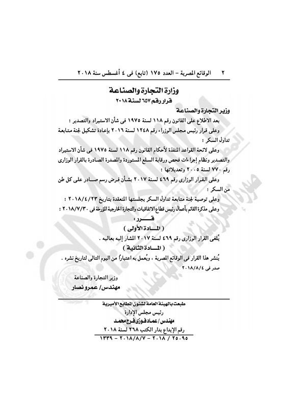 أسواق "التجارة والصناعة" تقرر إلغاء فرض رسوم على صادرات السكر الثلاثاء 07 أغسطس 2018 - 06:09 م 8/7/2018 6:09:01 PM عمرو نصار زير التجار والصناعة المصدر - خاص طباعة شارك نشرت الوقائع المصرية، فى العدد رقم 175 "تابع" الصادر بتاريخ 4 أغسطس 2018، قرار وزارة التجارة والصناعة رقم 657 لسنة 2018.وفيما يلى نص القرار: طباعة شارك تابع المصدر علي جوجل نيوز تطبيق نبض
