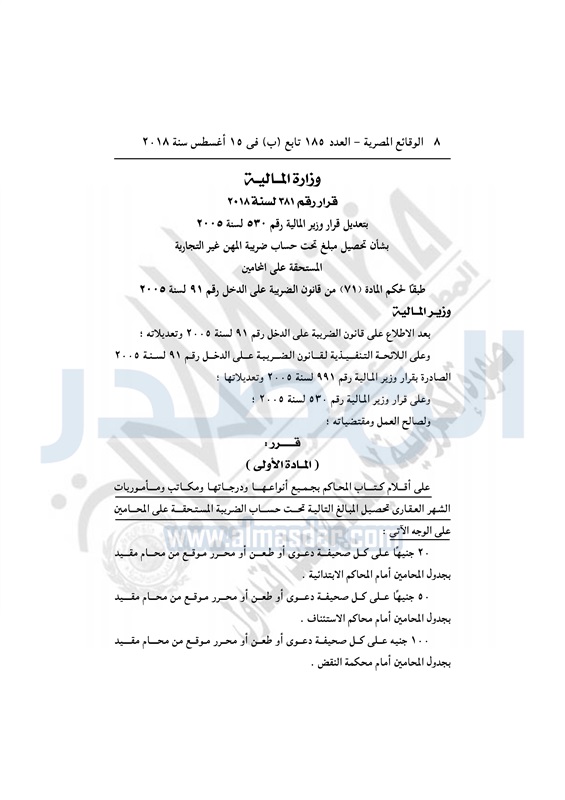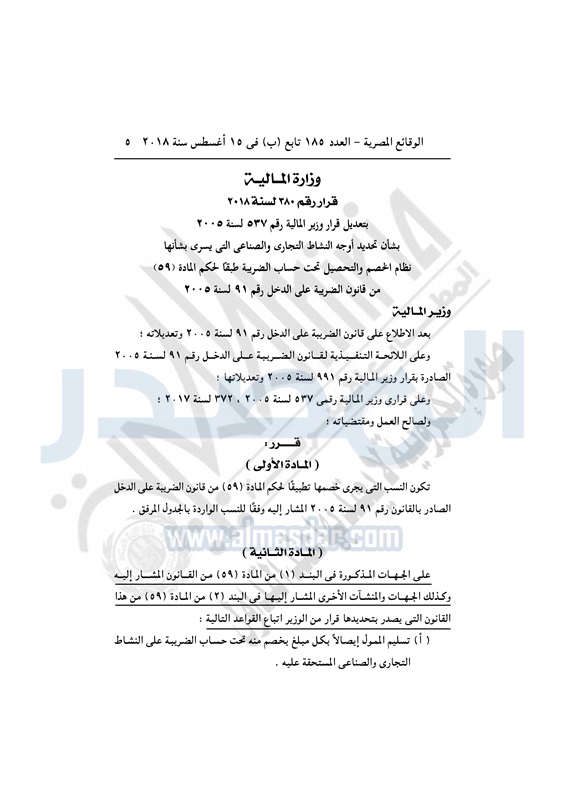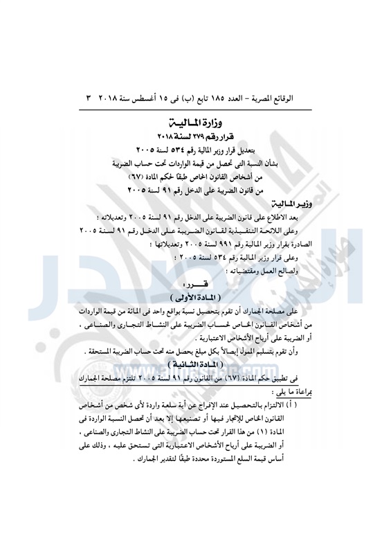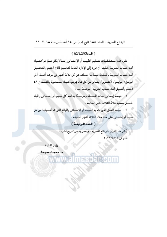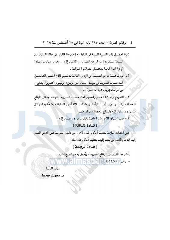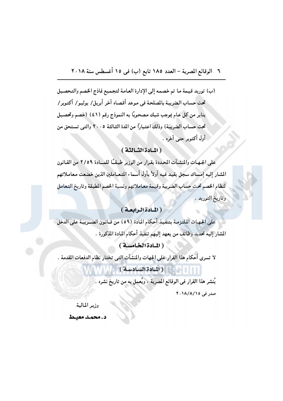 أخبار مصر "المالية": تعديل بعض أحكام قانون الضريبة على الدخل الأحد 19 أغسطس 2018 - 11:01 م 8/19/2018 11:01:53 PM محمد معيط وزير المالية المصدر - خاص طباعة شارك نشرت الوقائع المصرية، فى العدد رقم 185 "تابع" "ب" الصادر بتاريخ 15 أغسطس 2018، قرارات وزارة المالية رقم 379 ، 380 ، 381 لسنة 2018.وفيما يلى نص القرار: طباعة شارك تابع المصدر علي جوجل نيوز تطبيق نبض