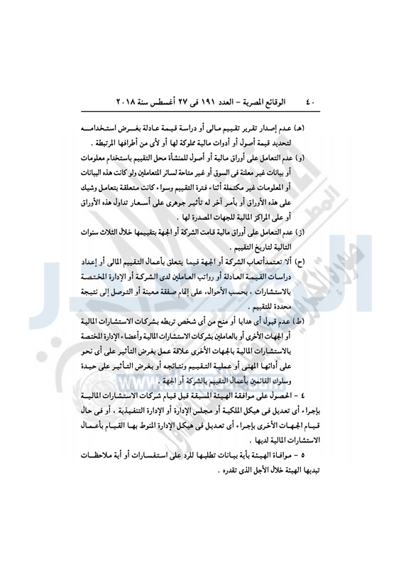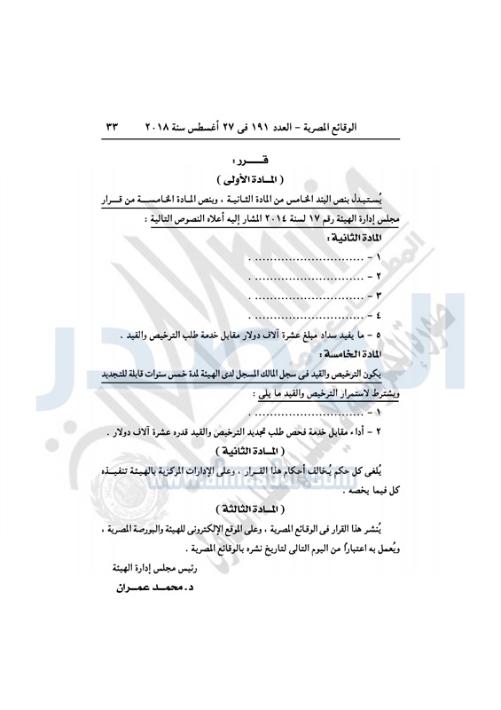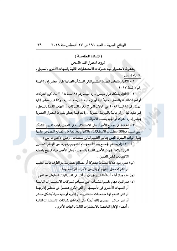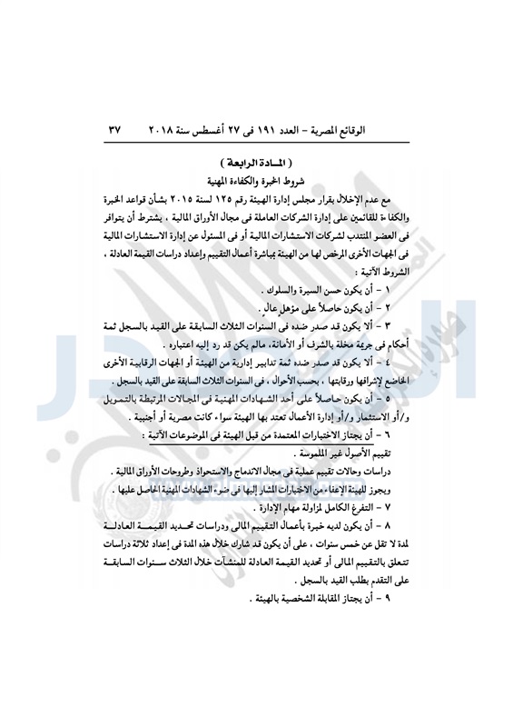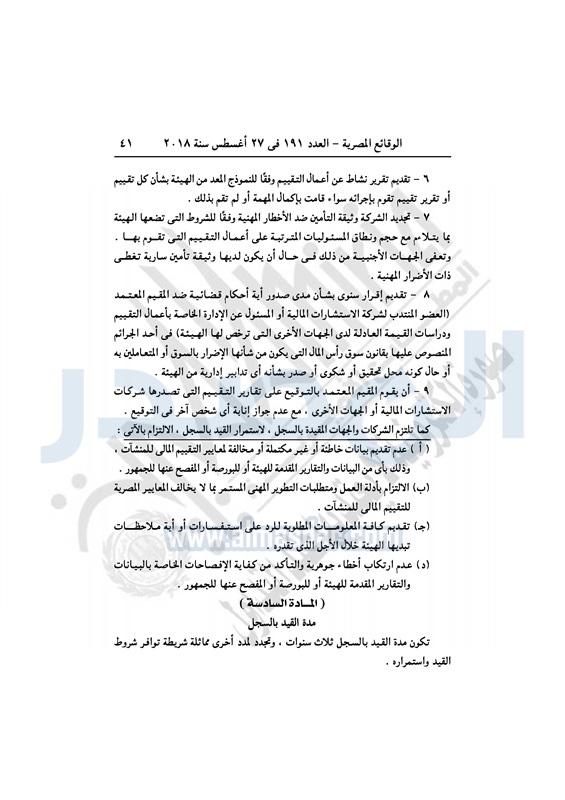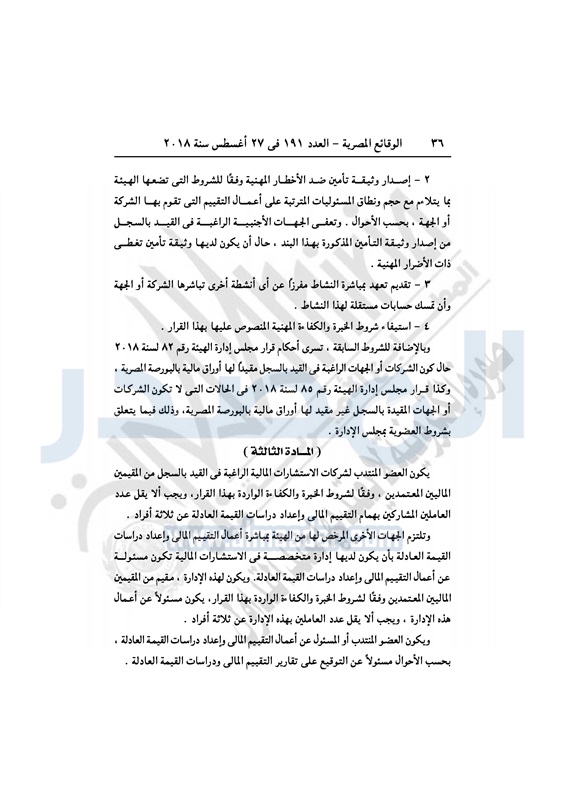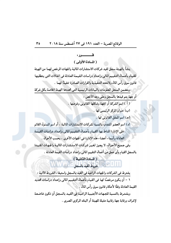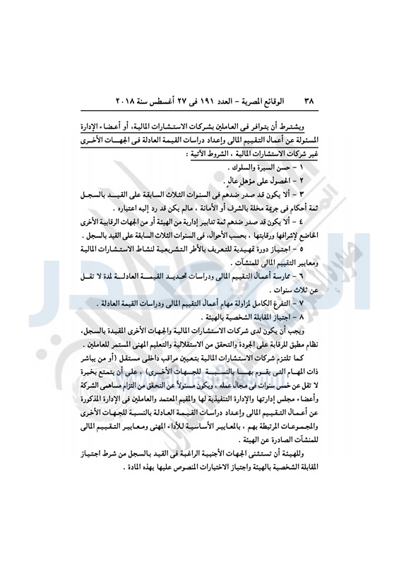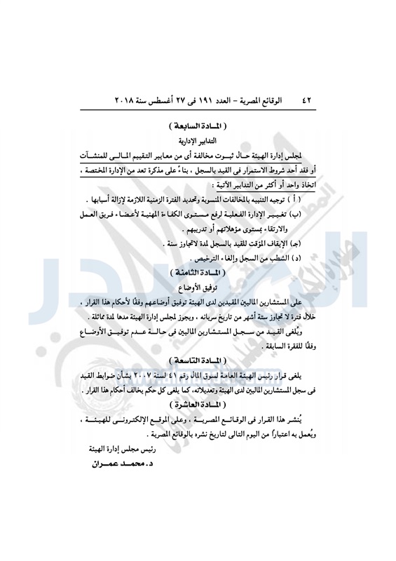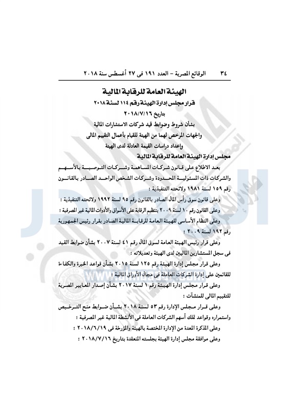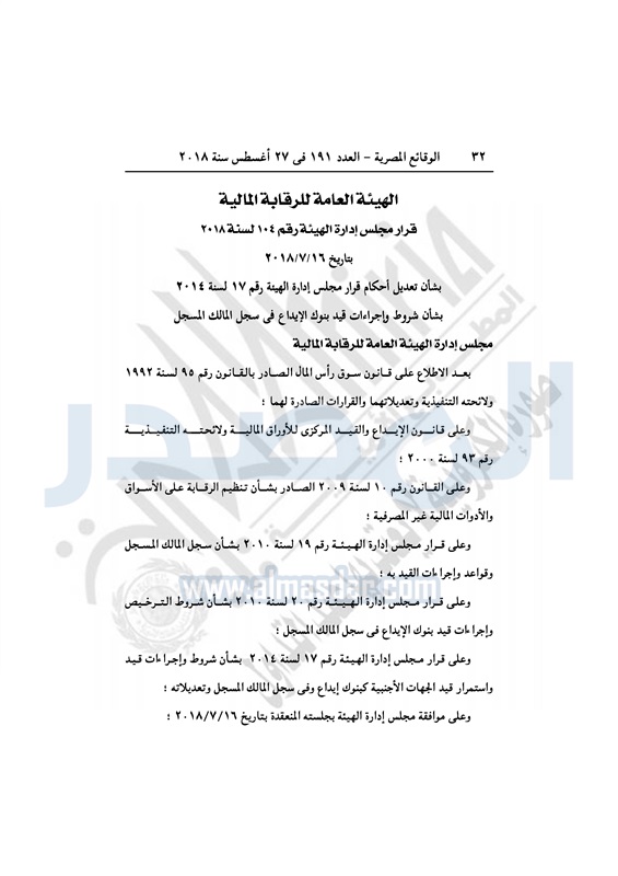 نشرت الوقائع المصرية، فى العدد رقم 191 تابع الصادر بتاريخ 27 أغسطس 2018، قرارات الهيئة العامة للرقابة المالية، وهما قرار رقم 104 لسنة 2018، بشأن تعديل شروط وإجراءات قيد بنوك الإيداع في سجل المالك المسجل، وقرار رقم 114 لسنة 2018، بشأن شروط وضوابط قيد شركات الاستشارات المالية.